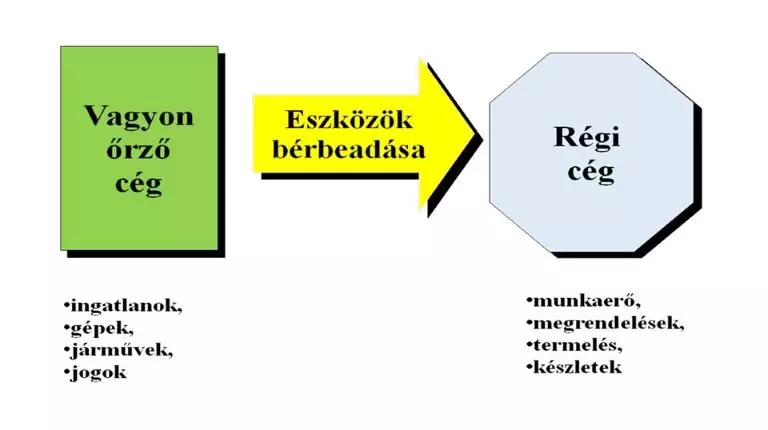 az új cég a tulajdonába került vagyontárgyakat bérbe adja a régi cég részére, és az árbevételként elszámolt bérleti díjból biztosítja a vagyontárgyak karbantartását, felújítását, és a további vagyontárgyak beszerzését.